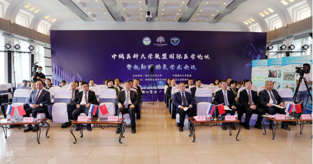 为进一步贯彻落实习近平总书记关于“有效开展国际联控”“调动全球资源,打赢疫情阻击战”等国际合作抗疫重要论述精神及习近平总书记和俄罗斯普京总统有关新冠疫情防控通话达成的共识,进一步加强中俄医学领域的国际交流与合作,搭建中俄医科大学联盟沟通互鉴平台。配合2021国际产学研用会议的召开,在教育部支持下,6月17日,由哈尔滨医科大学和中俄医科大学联盟主办,中国教育国际交流协会和黑龙江省欧美同学会协办的“中俄医科大学联盟国际医学论坛暨抗新冠肺炎学术会议”成功召开,会议采用“线上+线下”的方式举行,线下中方主会场设在哈尔滨医科大学。