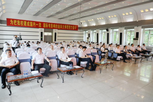 在庆祝中国共产党成立100周年之际,为推进学校党史学习教育深入开展,按照省高校党史学习教育领导小组统一要求和学校党委整体工作安排,6月29日下午,我校党委书记张斌发挥表率示范作用,以“弘扬红医精神 传承红色基因 坚守立德树人初心 培育民族复兴时代新人”为题,为全校党员干部和师生员工讲党史学习教育专题党课。省高校党史学习教育巡回指导三组组长刘恒、成员陈瑞雪应邀到校参加专题党课讲授活动并指导工作。此次专题党课采取线上线下相结合的方式进行,我校各级党组织及广大师生通过多种形式收听党课。党委副书记袁重胜主持专题党课。