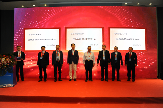 参会的各位院士为药学院“创新药物分析技术研究中心、药学信息研究中心、抗病毒药物研究中心”揭牌。