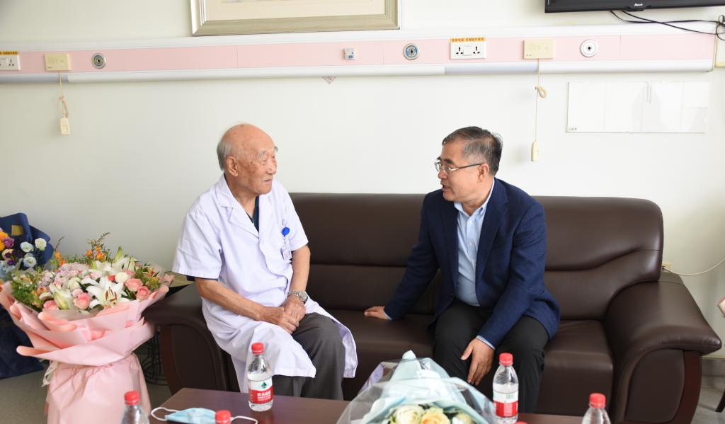 在哈医大二院王志成教授的办公室里,张学与王教授促膝交谈,感谢他为学校骨科事业发展付出的心血和汗水。张学表示,王志成教授与学校同龄,95岁仍精神矍铄、神采奕奕,坚守在骨外科临床救治第一线,是所有哈医人学习的榜样和楷模。张学祝愿王志成教授保重身体、健康快乐,继续为学校发展建设贡献力量,共同迎接哈医大百年华诞!
