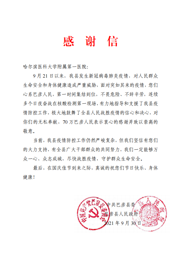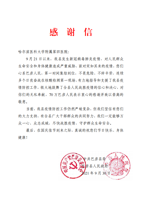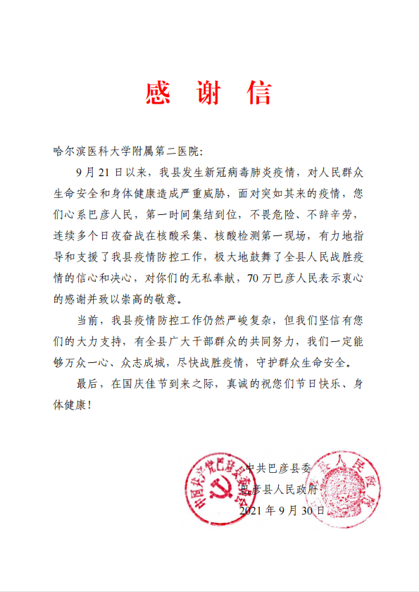 国庆前夕,我校附属一院、二院、肿瘤医院、四院分别收到巴彦县委县政府的感谢信,感谢他们“有力地指导和支援了我县疫情防控工作,极大地鼓舞了全县人民战胜疫情的信心和决心。”