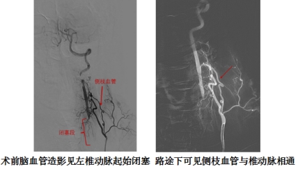 李永利带领团队经过仔细阅片发现,在椎动脉旁边有一支粗大的颈升动脉经侧枝与椎动脉远段相通,可以经这支血管迂回到闭塞段远端逆行凿通闭塞段。团队进行了反复的验证和讨论,最终决定为其实施经侧枝血管逆向开通慢性椎动脉闭塞介入手术。李永利指出,逆行开通手术适用于已形成侧枝血流的颈动脉和椎动脉闭塞患者,其最佳优势在于给一些介入困难路径的患者提供了新的手术通道,在不需要开刀的情况下,经股动脉或者手臂的血管就可以完成操作。