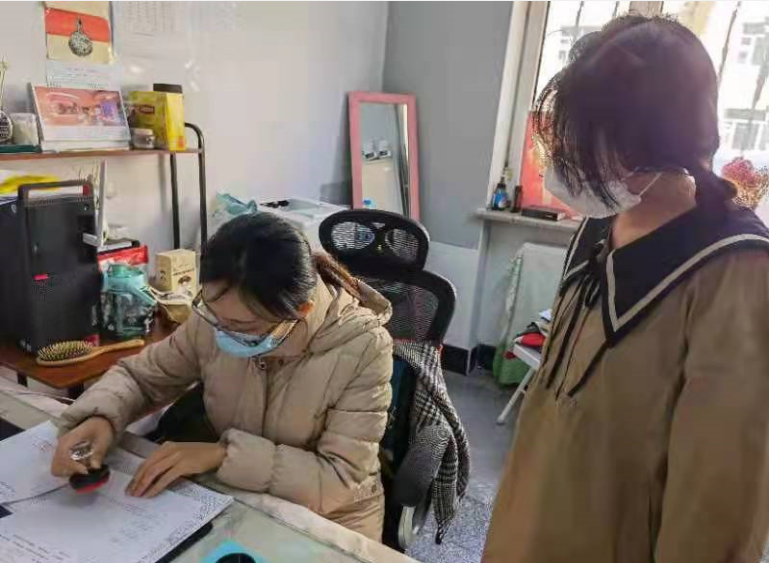 公卫学院辅导员刘洋到毕业生寝室为学生毕业生登记表和考研学生政审表盖章
