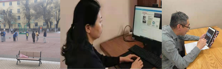 基础医学院辅导员薛亮与学生一同打篮球,基础医学院辅导员王玉清、蔡渊组织年级党团支部开展线上党团活动,与学生谈心谈话