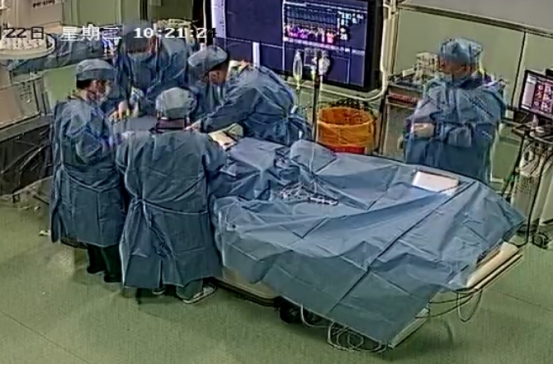 心脏停跳,意味着生命的终止。正在做术前准备的医生见状临危不乱,丝毫没有犹豫,立即在手术台边上为他进行胸外心脏按压。一次、两次、三次……不停地按压,保证身体其他器官的灌注,与死神赛跑。与此同时,心内科副主任侯静波教授沉着冷静,当机立断,与直系家属电话沟通,决定在心脏持续按压的同时为患者立即实施“救命神器”ECMO(人工心肺)。