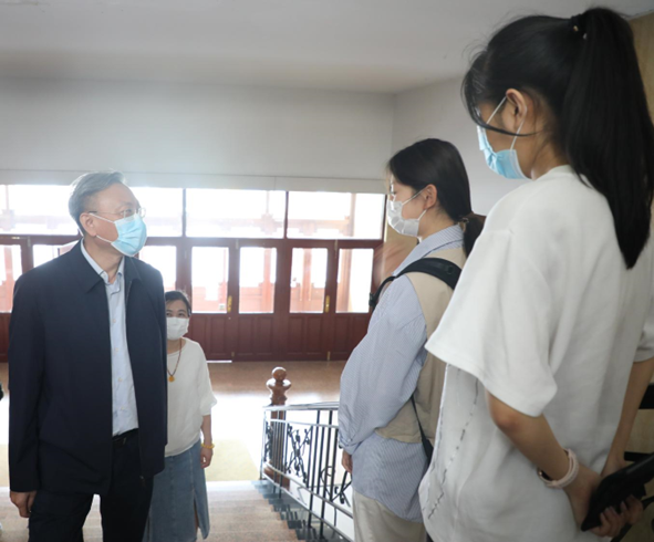 在本科生考场和线上考场监考室,张斌详细询问了考试安排、考场设置、监考人员配备等情况,叮嘱工作人员要树立以学生为中心理念,合理安排考试时间,细致入微做好服务工作,全力保障考试过程安全、稳定、有序,为学生营造一个良好的考试环境。路上遇到刚刚结束一轮考试的本科生们,张斌为他们送上节日的祝福,并鼓励同学们要保持好心态、积极备考。
