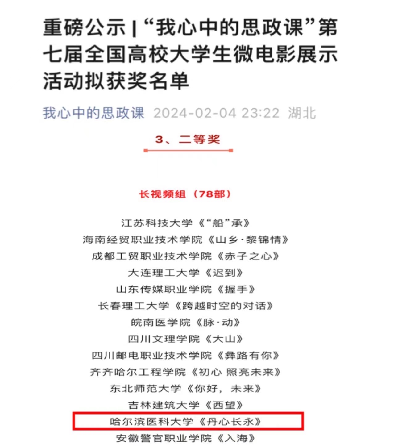 近日,由教育部高校思政课教学指导委员会、武汉大学马克思主义学院主办的“我心中的思政课”第七届全国高校大学生微电影展示活动评选结果揭晓,马克思主义学院创作的微电影《丹心长永》喜获二等奖。