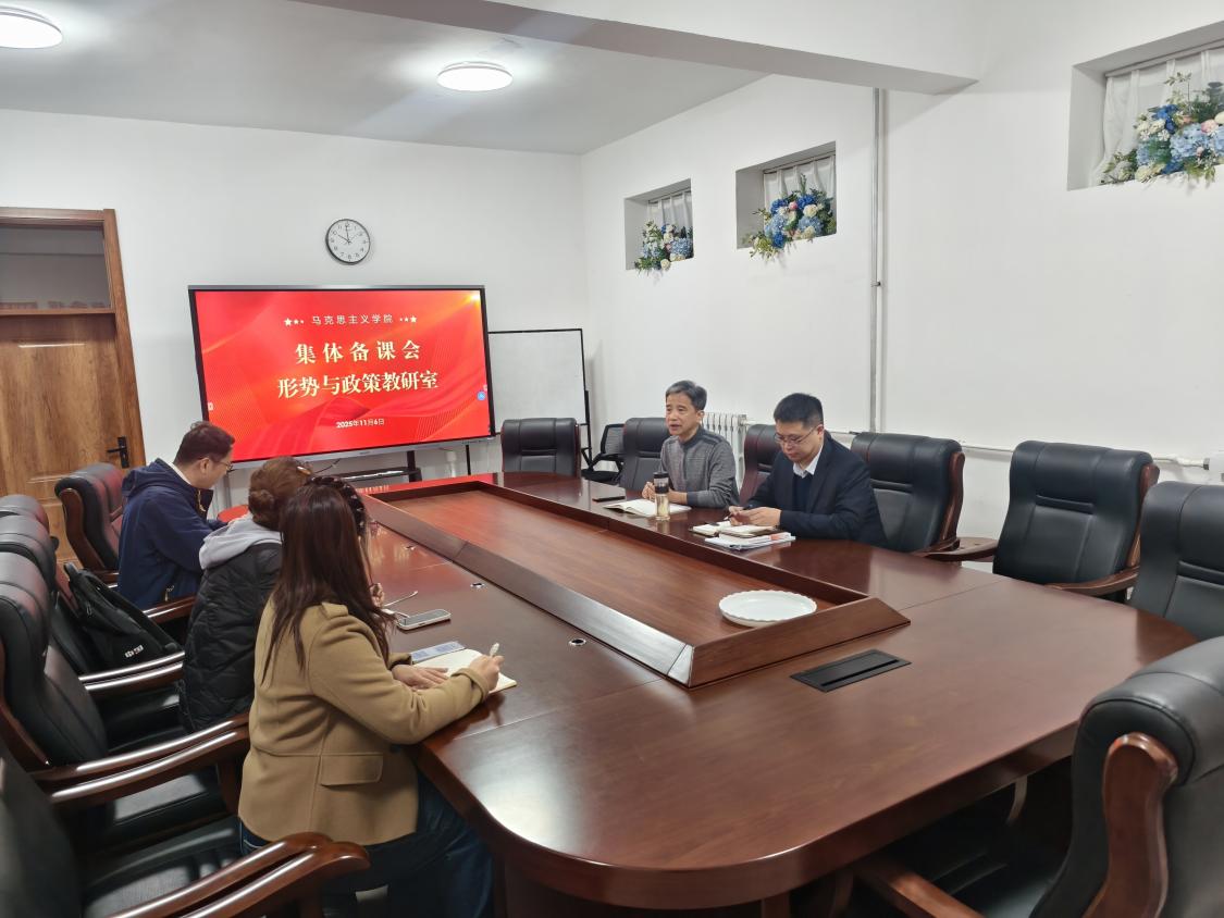 为深入学习贯彻落实党的二十届四中全会精神,推进习近平新时代中国特色社会主义思想和党的最新理论成果进教材、进课堂、进头脑,11月6日上午,形势与政策教研室组织召开集体备课会。会议由教研室主任张英涛主持,全体任课教师参加会议。