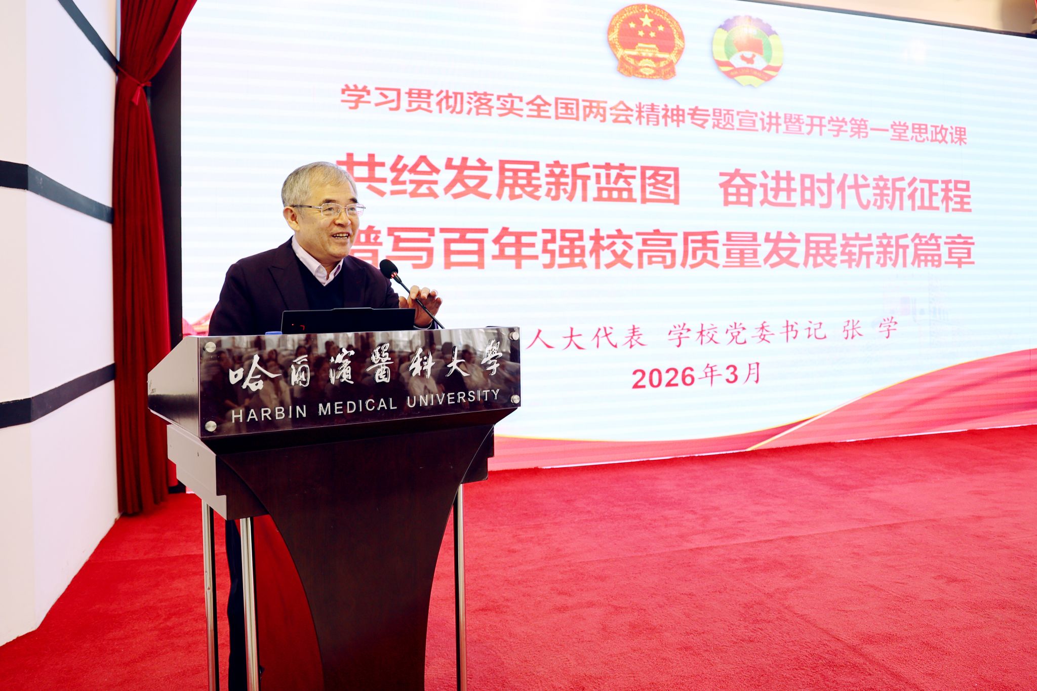 张学强调,习近平总书记在全国两会期间的重要讲话,从全局出发对关系我国发展的许多重大问题作了深刻阐述和工作部署,具有很强的战略性、指导性和针对性。要深刻领会习近平总书记重要讲话的精神实质和实践要求,切实把思想和行动统一到习近平总书记重要指示精神和党中央决策部署上来,扎实做好学校各项工作,努力在推进中国式现代化中展现新作为。张学系统阐释了政府工作报告和“十五五”规划纲要,聚焦一体推进教育科技人才发展、全面推进健康中国建设等目标任务,将学校建设与服务国家战略和龙江振兴发展紧密结合,明确学校未来发展方向和重点任务。他强调,全校师生要更加紧密地团结在以习近平同志为核心的党中央周围,深刻领悟“两个确立”的决定性意义,增强“四个意识”、坚定“四个自信”、做到“两个维护”。