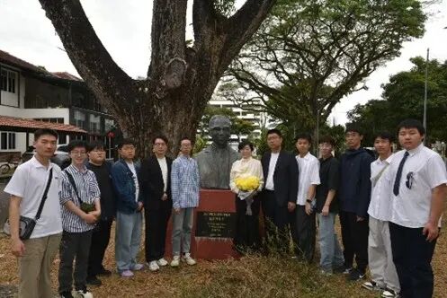 师生一行随后前往槟城研究院交流。这里矗立着一座由哈尔滨医科大学于2014年赠予槟城人民的伍连德医生铜像。师生们怀着崇敬的心情,在铜像前肃立默哀并敬献鲜花,以表达对先贤的深切缅怀 。