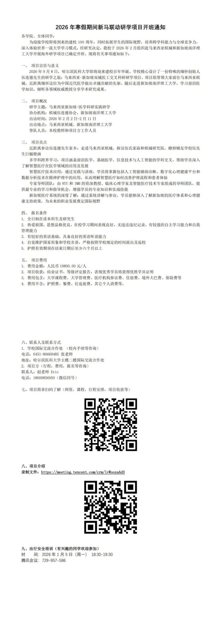 关于组织哈尔滨医科大学2026年寒假期间海外研学项目开班通知
