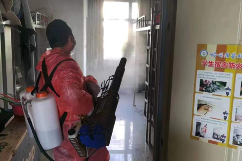 校园封控期间,每日的消杀和垃圾清运工作也是后勤管理处协调物业公司完成的重要任务之一。从8名工作人员,到后来的20人住校服务,他们没有在困难面前退缩,背着硕大的消毒水箱,穿着防护服,往返于每栋宿舍楼、商服楼、餐饮服务中心、图书馆,只要是大家活动的公共区域都不留死角。同时,还要对所有校园垃圾进行严格分类处理,及时清运,一天下来的辛苦程度可想而知。但他们清楚自己身负的使命和责任,他们只希望能够给同学们一个安全舒适的环境。