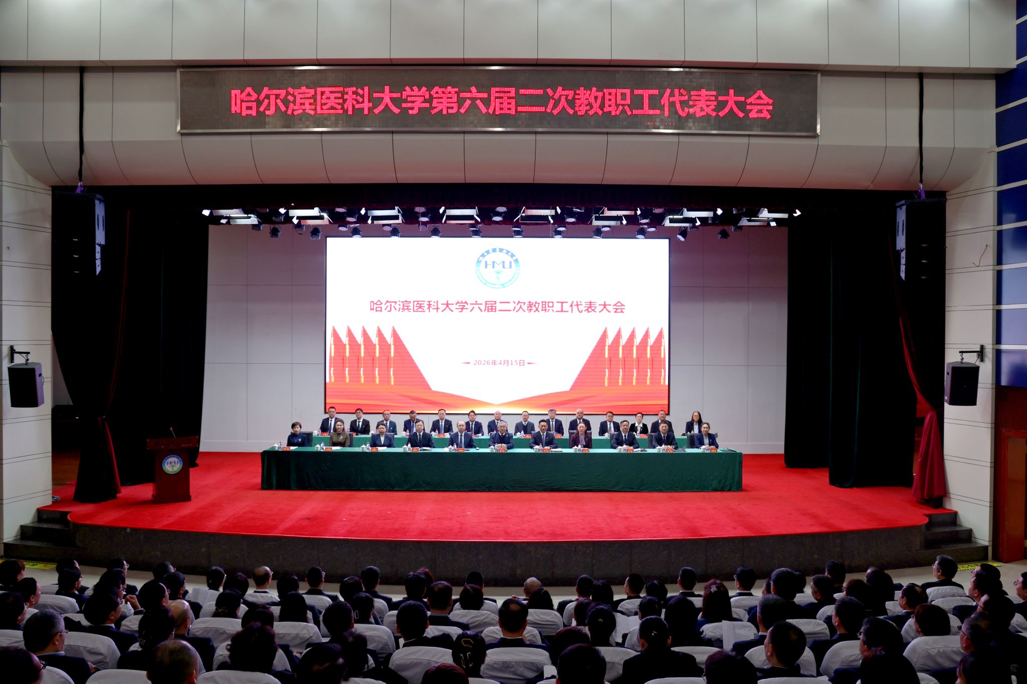 2026年4月15日,哈尔滨医科大学第六届教职工代表大会第二次会议在主楼科技会馆召开。学校党委书记张学出席会议并讲话,校长季勇作学校工作报告。学校领导班子成员、第六届教职代会281名代表参加会议,学校部分离退休老同志、民主党派代表及非直属单位负责人列席会议。