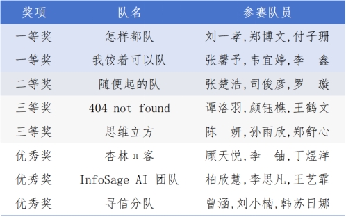 在黑龙江省赛区选拔赛中,“怎样都队”(刘一孝、郑博文、付子珊)斩获黑龙江省一等奖,以本科生组冠军战绩脱颖而出,晋级全国联赛,经过现场激烈角逐,最终获得全国联赛本科生组三等奖,指导教师安妮、冷雪卓获优秀指导教师奖。