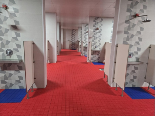 针对学生浴池地面因积水湿滑易引发摔倒的安全隐患,校园服务保障部将其列为重点民生实事,迅速行动、高效落实。经过认真选型,采购了耐磨性强、防滑性能突出的高密度防滑垫,工作人员利用夜间时段连续三晚施工,顺利完成防滑垫铺设工作,得到了同学们的广泛认可与好评。