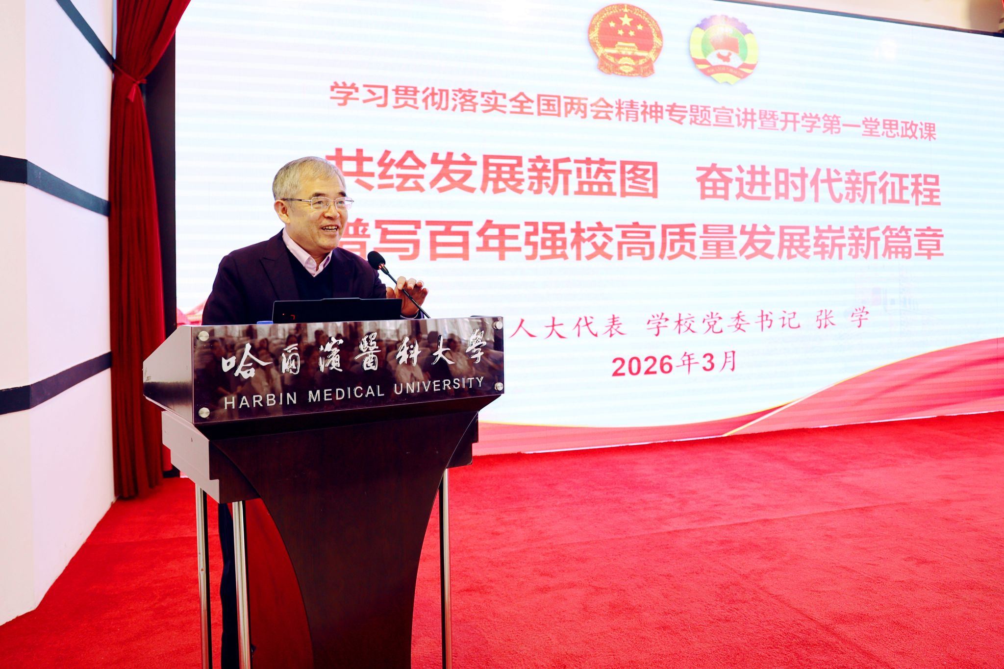 张学强调,习近平总书记在全国两会期间的重要讲话,从全局出发对关系我国发展的许多重大问题作了深刻阐述和工作部署,具有很强的战略性、指导性和针对性。要深刻领会习近平总书记重要讲话的精神实质和实践要求,切实把思想和行动统一到习近平总书记重要指示精神和党中央决策部署上来,扎实做好学校各项工作,努力在推进中国式现代化中展现新作为。张学系统阐释了政府工作报告和“十五五”规划纲要,聚焦一体推进教育科技人才发展、全面推进健康中国建设等目标任务,将学校建设与服务国家战略和龙江振兴发展紧密结合,明确学校未来发展方向和重点任务。他强调,全校师生要更加紧密地团结在以习近平同志为核心的党中央周围,深刻领悟“两个确立”的决定性意义,增强“四个意识”、坚定“四个自信”、做到“两个维护”。