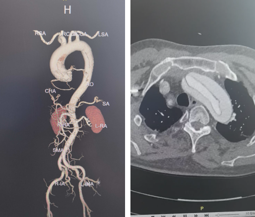 患者为73岁男性,因急性主动脉夹层入院。术前检查显示,夹层范围广泛,累及升主动脉、主动脉弓、降主动脉直至腹主动脉,并波及多支重要分支血管,手术复杂度高。