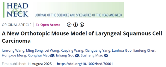 近日,哈医大肿瘤医院头颈肿瘤外科苗素生教授团队在国际权威期刊《Head & Neck》发表题为 《A New Orthotopic Mouse Model of Laryngeal Squamous Cell Carcinoma》的最新研究成果。该研究成功建立一种新型、稳定、高度可重复的喉鳞状细胞癌原位小鼠模型,可真实模拟患者肿瘤的发生发展及免疫微环境变化,为探索喉癌的发病机制、肿瘤免疫学研究及新型治疗策略提供重要的实验基础。