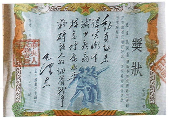 赵成林教授于1952年在抗美援朝反细菌战中被评为爱国卫生运动模范,受中央人民政府卫生部嘉奖