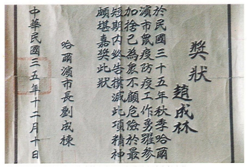 赵成林教授因防鼠疫工作成绩突出于1946年获哈尔滨市长嘉奖