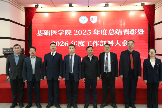 2026年3月5日下午,基础医学院2025年度总结表彰暨2026年度工作部署大会在主楼三楼演讲厅隆重召开。学校党委常委、副校长周钦,学校党委常委、副校长张明宇,学院党委书记李辉、院长潘振伟及领导班子其他成员出席会议,伍连德书院院长兼基础医学院党委副书记、纪委书记刘振洪主持大会。学院全体教职工齐聚一堂,共同回顾过去一年的奋斗历程,擘画未来发展新篇章。