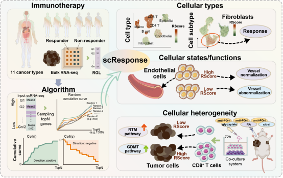 scResponse能够捕捉不同细胞亚型或细胞状态对免疫治疗响应的细微影响,包括血管内皮细胞的血管正常化状态、巨噬细胞的极化状态、CD8+T细胞的耗竭亚型以及不同成纤维细胞亚型的相反作用等。通过将免疫治疗响应与单细胞状态相联系,scResponse能够描绘不同的生物学过程是如何塑造细胞状态,进而导致不同的免疫治疗结局。例如,上皮细胞在响应和非响应患者中表现显著响应评分(RScore)差异,其代谢变异可能是潜在的影响因素。通过整合泛癌单细胞转录组数据,团队利用scResponse确定了与肿瘤细胞响应状态相关的关键代谢通路,其中乙醛酸和二羧酸代谢(glyoxylate and dicarboxylate metabolism,GDMT)增强免疫治疗敏感性,而视黄醇代谢(retinol metabolism,RTM)则抑制免疫治疗效果。另外,通过癌细胞和CD8⁺T细胞共培养实验和小鼠荷瘤模型,团队对这两个通路对免疫治疗效果影响的相反作用进行了实验验证,为scResponse分析框架的实用性提供了概念验证。