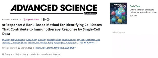 2026年3月23日,哈尔滨医科大学基础医学院郝大鹏教授团队的博士后董琪和博士生黄海军等在《Advanced Science》期刊发表题为《scResponse: A Rank-Based Method for Identifying Cell States That Contribute to Immunotherapy Response by Single-Cell Data》的研究论文。该研究首次提出了一种能够量化单细胞对免疫治疗响应程度的算法scResponse,并建立便于研究人员使用的R包“scResponse”。该工具为发现肿瘤治疗新靶点和开发新型免疫治疗增敏策略提供了新的机制性见解。