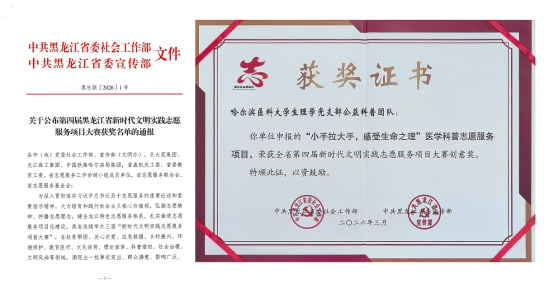 近日,中共黑龙江省委社会工作部公布了第四届黑龙江省新时代文明实践志愿服务项目大赛获奖名单,生理学党支部公益科普团队的“小手拉大手,感受生命之理”医学科普志愿服务项目获得创意奖。