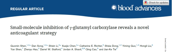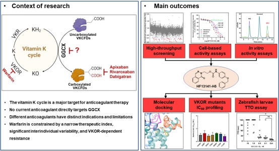 2026年4月14日,哈尔滨医科大学基础医学院沈国民教授团队,联合美国北卡罗莱纳大学教会山分校Jian-Ke Tie教授和南京医科大学曹青教授在《Blood Advances》发表题为《Small-molecule inhibition of γ-glutamyl carboxylase reveals a novel anticoagulant strategy》的研究论文。该研究筛选到首个靶向抑制GGCX的先导化合物,并且该化合物可以解决VKORC1突变导致的临床抗凝药华法林耐受的问题。该研究为研发靶向GGCX的新型抗凝药,以适应临床上不同抗凝需求提供了新思路。