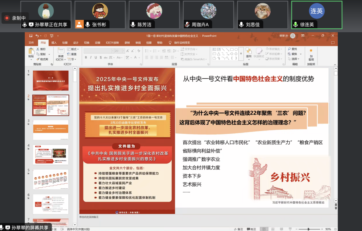 孙翠翠老师就第一章的整体知识框架、教学环节设计进行经验分享,从中央一号文件导入新课,运用启发式教学方式引导学生明确中国特色社会主义的制度优势,从“首次突破”引导学生读懂中国信心。