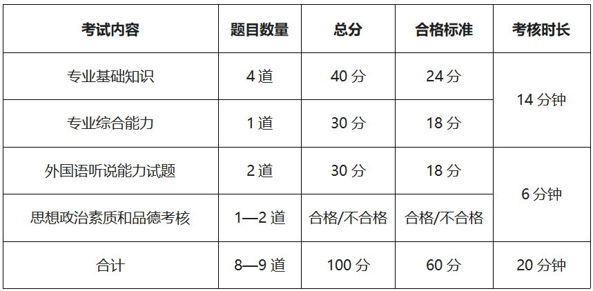 复试考核满分100分,包括专业基础知识(40分)、专业综合能力(30分)、外语应用能力(30分)和思想政治素质和品德考核(合格/不合格)。其中,思想政治素质和品德考核成绩不计入总成绩,思想品德考核不合格者不予录取。
