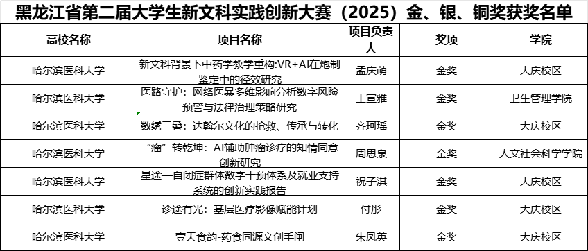 此次获奖不仅是对团队专业能力与创新思维的高度认可,更为学校赢得了荣誉——团队凭借优异成绩成功拿到全国总决赛“入场券”,即将代表哈尔滨医科大学站上全国舞台,向业界展示医科院校学子在新文科领域“文医交叉、实践赋能”的独特优势。彰显了哈医大在新文科建设中“立足医科特色、解决实际问题”的鲜明导向。团队将全力备赛,争取再创佳绩!