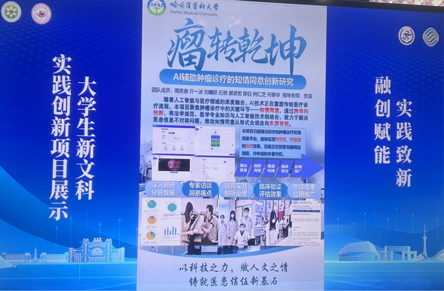 在2025年10月12日落幕的第二届黑龙江省大学生新文科实践创新大赛中,哈尔滨医科大学人文学院法学专业2023级学生周思泉的项目《“瘤”转乾坤:AI辅助肿瘤诊疗的知情同意创新研究》(指导教师:贺苗)在经济学、管理学、法学类专业理论组获得金奖。