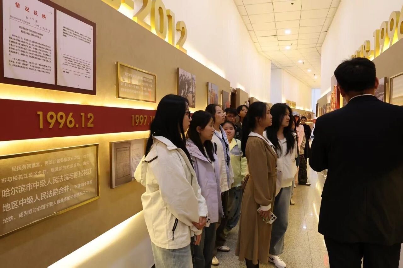 随后,在法院院史展览区,同学们系统了解了哈尔滨中院自建院以来具有里程碑意义的裁判案例。从社会主义改造时期的典型判例,到改革开放后的经济纠纷创新判决;从重大刑事案件审判,到知识产权、互联网等新型案件的突破性审理——一部波澜壮阔的地方法治史在大家面前徐徐展开。许多同学在公共卫生案件展区驻足讨论,深切感受医学与法学交叉领域的现实意义与社会价值。