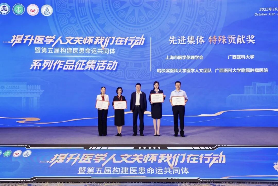 11月1日上午,由《中国医学伦理学》杂志、中国抗癌协会、广西医科大学、西安交通大学医学部公共卫生学院、北京大学医学人文学院、中国人民大学伦理学与道德建设研究中心、上海市医学伦理学会、清华大学医学院等8家单位联合主办,广西医科大学人文社会科学学院等单位承办的“提升医学人文关怀我们在行动暨第五届构建医患命运共同体”学术大会在广西南宁举办。来自全国的医学人文专家、医务人员、患者代表、医学生代表、医院管理者、媒体代表等共计500余人参会。哈尔滨医科大学医学人文团队在尹梅教授带领下受邀参会,荣获大会“特别贡献奖”,团队师生作品在评选中获得多项荣誉。