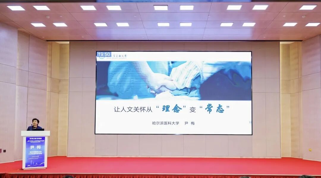 哈尔滨医科大学尹梅教授在大会主题报告环节作了题为《让人文关怀从“理念”变“常态”》的专题发言。她从理论构建、教学实践与临床融入等多个维度,系统阐述了医学人文关怀落地为常态工作的路径与机制,受到与会专家的高度认同。