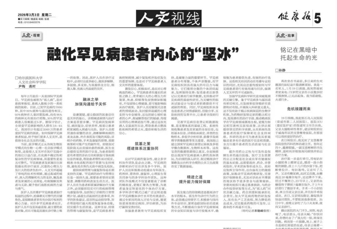 2026年2月28日是第19个国际罕见病日,今年的主题是“不止罕见”。近年来,随着政策支持与科研投入的持续加码,罕见病领域正逐步从“鲜为人知”走向“备受关注”。哈尔滨医科大学罕见病研究的核心学者围绕我国罕见病防治体系的建设与未来发展方向进行前瞻性展望,人文社会科学学院院长尹梅教授和遇时博士在《健康报》发表学术文章,为罕见病事业的高质量发展贡献智慧与思考。