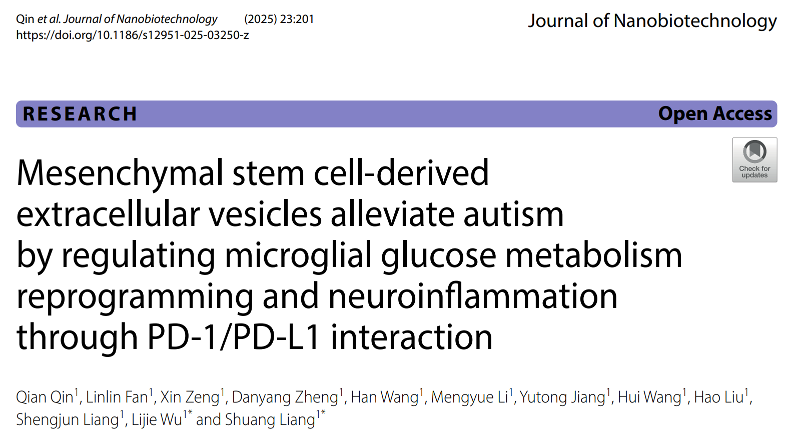近日,哈尔滨医科大学公卫学院梁爽/武丽杰教授团队在国际知名期刊Journal of Nanobiotechnology(中科院1区Top期刊,IF=10.6)上发表了题为“Mesenchymal stem cell-derived extracellular vesicles alleviate autism by regulating microglial glucose metabolism reprogramming and neuroinflammation through PD-1/PD-L1 interaction”的高水平文章(2025 Mar 11;23(1):201)。该研究首次阐明了PD-L1/PD-1信号轴通过调控小胶质细胞糖代谢重编程参与ASD疾病的新机制,揭示了MSC-EVs经由ERK/HIF-1α信号通路可改善神经炎症和糖酵解异常激活的双重治疗效应,为深入理解ASD的“免疫-代谢”机制提供了新视角。