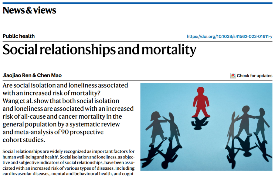 研究发表同日,Nature Human Behaviour杂志的News & Views 栏目发表特邀专家评述“Social relationships and mortality”,充分肯定了本项研究对提高公众对社会隔离和孤独风险认识的重要意义。