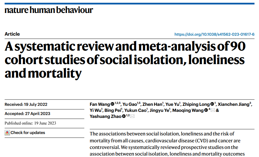 我校公共卫生学院王帆、赵亚双教授团队在社会隔离和孤独与死亡风险研究领域取得最新进展,研究成果论文《A systematic review and meta-analysis of 90 cohort studies of social isolation, loneliness and mortality》于2023年6月被Nature Human Behaviour(IF=29.9)收录并发表。第一作者为王帆、高宇,通讯作者为赵亚双、王茂清。
