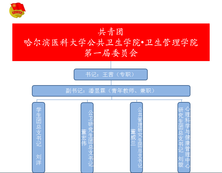 共青团哈尔滨医科大学公共卫生学院•卫生管理学院委员会(简称院团委)是在院党委和校团委领导下的先进青年的群众组织。作为党的助手和后备军,担负着团结、教育和带领学院广大团员青年执行党的青年工作方针,坚定跟党走中国特色社会主义道路的政治使命。
