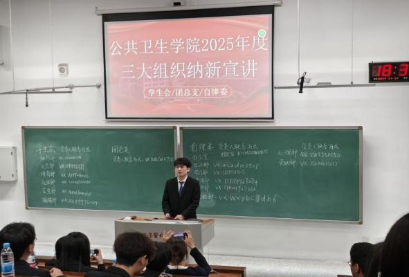 金秋送爽,微风轻抚。公共卫生学院学生党总支于9月8日晚在生理学馆三号教室举办学生干部组织纳新宣讲会。本次宣讲旨在让新生同学了解学院学生干部组织,并为学生干部队伍注入新的活力。本次宣讲由学院学生会副主席王煜博主持,学院自律委主席郝桐、学生会副主席何宇扬、团总支副书记张敬苒分别代表三大学生干部组织发言,2025级新生年级主任曹璨老师出席宣讲会并做总结性讲话,学院三大学生干部组织全体干部及2025级预防医学及公共事业管理专业全体同学参加本次宣讲会。