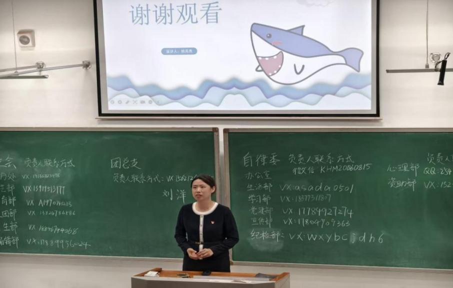 曹璨老师在本次纳新宣讲活动中做总结性讲话,她感谢并肯定了各位学生干部对会议的积极筹备,并倡导各位新生同学踊跃参与学生干部组织的纳新,在大学生活中用规划意识为行动领航,用规则意识为行动护航,珍惜学习和锻炼的机会并明确个人的大学目标。