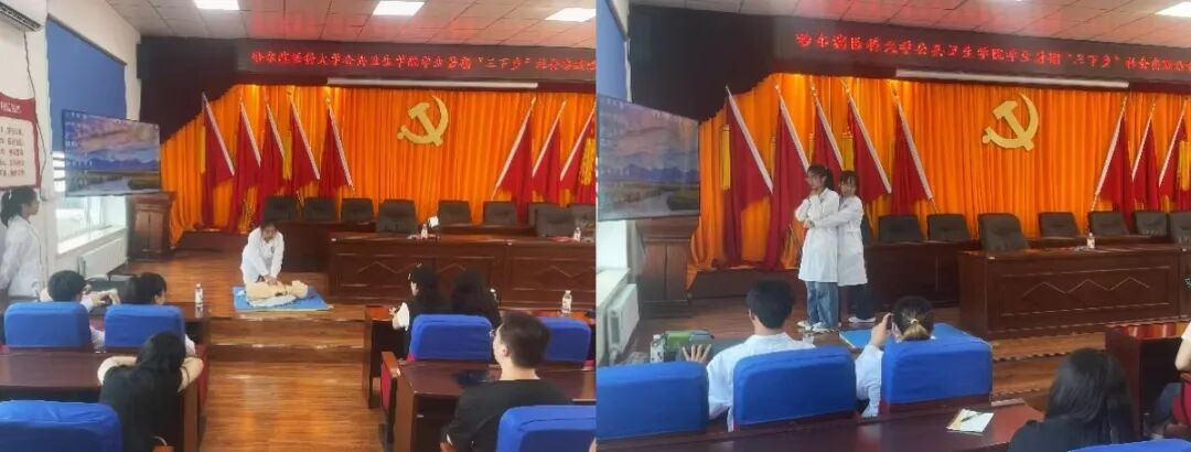 公卫学子积极践行青年的责任和担当,把传播公共卫生健康知识作为己任,把守护人民健康幸福生活作为使命。社会实践团队成员李书桐、孟昊雯向村民开展了关于儿童和老年人常见病防治的科普宣讲,具体介绍了包括水痘、手足口病、高血压、糖尿病等疾病的预防保健措施,张喆和张元柯等同学讲解了如何利用黄金时间,对患者施行心肺复苏和海姆利克法的急救措施,村民们认真聆听,有的还拿起手机进行录像学习;同时团队还进行了健康科普知识答题和分发健康宣传手册,并准备了学院的文创布袋作为精美礼品,现场反响热烈,本次健康科普宣讲也运用线上线下联动形式,在平房区委宣传部视频号“文明哈南”进行了同步直播,观看人数众多,互动良好,学生们耐心生动的讲解真正做到了让公共卫生科普知识入心入脑。