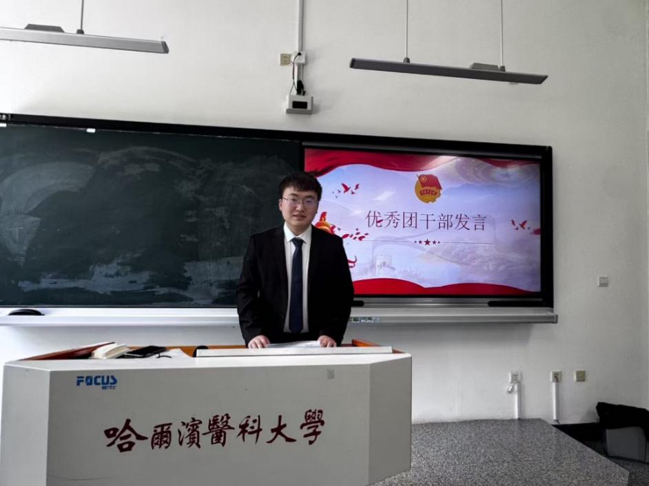誓言落下,老团员代表2023级预防医学专业郑宇辰同学上台发言,他以公共卫生先驱伍连德博士为榜样,号召大家传承“大医精诚”精神,鼓励新团员以更高标准要求自己,在公共卫生领域传承先辈精神,心怀大爱、勇于担当。