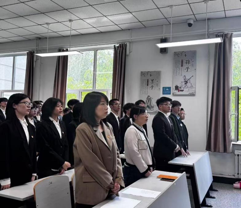 大会在雄壮的国歌声中拉开帷幕,全体师生齐唱《义勇军进行曲》,铿锵的旋律激荡起新时代青年的爱国热情。国歌奏毕,王茜书记和刘洋老师为32名新团员佩戴团徽,金色的团徽在胸前熠熠生辉,象征着共青团员坚定的信念。这一刻,所有新老团员感受到了肩上的使命——用行动践行誓言,不负青春之名。