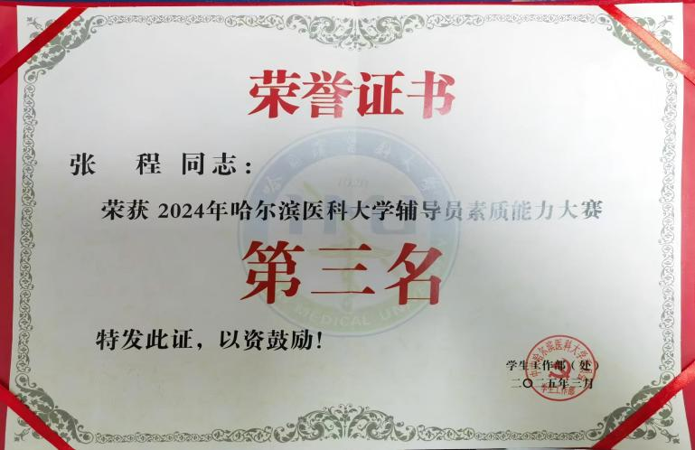 张程在2024年辅导员素质能力大赛中凭借扎实的专业素养和出色的临场表现,获第三名的优异成绩。这一荣誉不仅彰显了张程老师个人在思想政治教育、学生管理等方面的综合能力,也为学院辅导员队伍建设再添亮色。