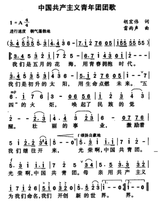 中国共产主义青年团团歌是《光荣啊,中国共青团》,由胡宏伟作词,雷雨声作曲。1988年5月8日,确定为中国共产主义青年团代团歌。2003年7月22日,正式定为中国共产主义青年团团歌。