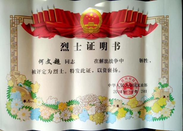 在家乡石门解放后,何文超在家书中曾说到:“等攻下元氏城,向部队请示想回家看看”。解放元氏城的战役取得了胜利,但是何文超却在战斗中永远倒下,他的青春永远定格在了尚且稚嫩的15岁。从参军到牺牲这一刻何文超战士从未回过家,正值青春大好年华却倒在返乡前的最后一程,未能亲眼看到孩子归来时父母脸上灿烂的笑靥;听不到年幼的弟弟妹妹围着自己打转,咿咿呀呀地叫着一声声“哥哥,哥哥”;感受不到家乡父老乡亲们夹道欢迎荣归故里的战斗英雄,村子里敲锣打鼓的热闹喜悦;目睹不到石门在解放后家乡繁荣发展,人民安居乐业的场景……