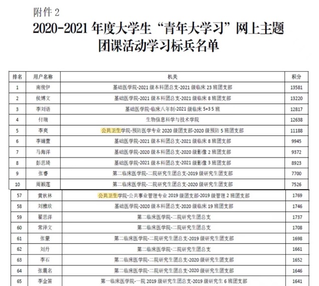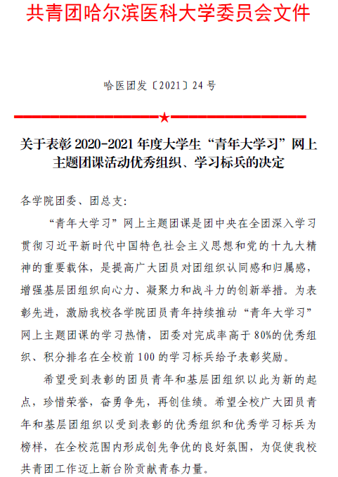 为进一步推动和落实“青年大学习”,充分发挥青春先进典型的模范带动和榜样引领作用,激发团员青年的学习热情,近日,共青团哈尔滨医科大学委员会下发《关于表彰2020-2021 年度大学生“青年大学习”网上主题团课活动优秀组织、学习标兵的决定》(哈医团发〔2021〕24号),对积分排名在全校前100 的学习标兵给予表彰奖励,我院2名同学被授予2020-2021 年度大学生“青年大学习”网上主题团课活动“学习标兵”称号。让我们先来看看榜样的风采!
